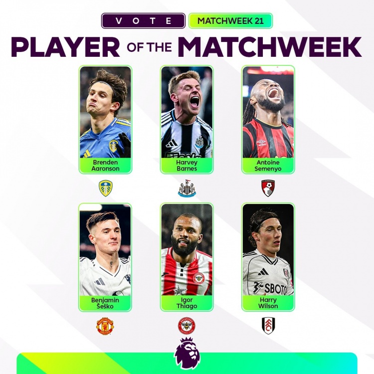 1月9日讯 英超官方公布了第21轮比赛最佳球员候选,塞梅尼奥、舍什科在列。